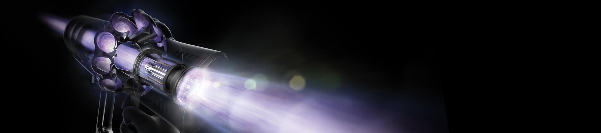 בשואב האבק מדגם ™Dyson Cyclone V10, מיקום המנוע מעל הידית משפר את מרכז הכובד ומקל על השימוש באזורים אליהם קשה להגיע כגון: מקומות גבוהים או מקומות צרים.